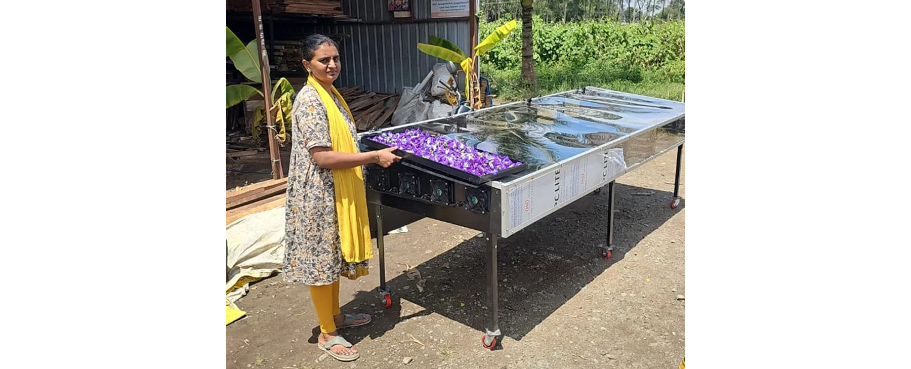 A Bengaluru-based customer of Rudra Solar Energy Pvt. Ltd. is using a Rudra Solar Dryer to efficiently dry blue pea flowers (Clitoria ternatea) for the production of premium blue pea flower tea, along with drying vegetables, fruits, and other flowers.