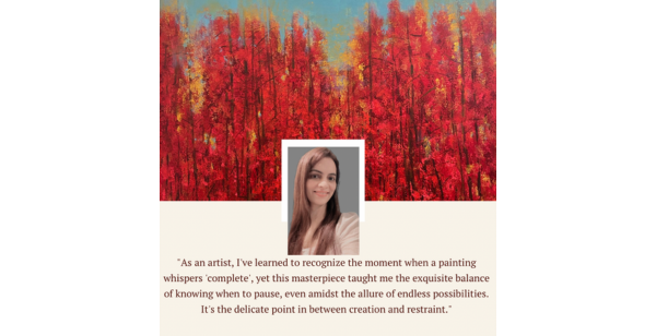 Central to Vinita’s artistic oeuvre is her signature theme, “Whispers of the Wilderness.” This theme encapsulates the quiet yet profound dialogues between the earth and its inhabitants. Through her impressionistic paintings, she captures the resilience, strength, and nurturing qualities of nature, particularly through her depictions of forest trees. Each painting is more than just a representation of individual trees; it is an exploration of entire ecosystems, with every branch symbolizing the interconnectedness of all living things.